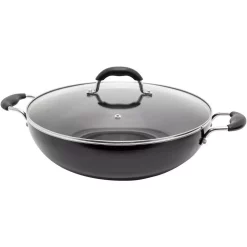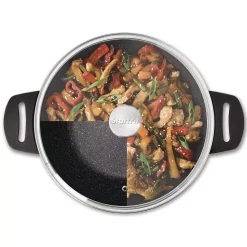 Ideal for everything from stir-frying and sauteing to simmering and braising, the deep and wide design of the Starfrit 033170-002-0000 Jumbo 13.5 In. Wok with Lid fits large quantities of food without overcrowding. Its nonstick surface allows you to cook with a minimal amount of oil or butter for leaner, healthier cooking and it wipes clean in a breeze. The riveted, ergonomic handles stay cool to the touch and the tempered glass lid with steam vent allows you to see whats cooking and avoids boiling over. This wok is oven safe up to 350F and completely dishwasher safe.