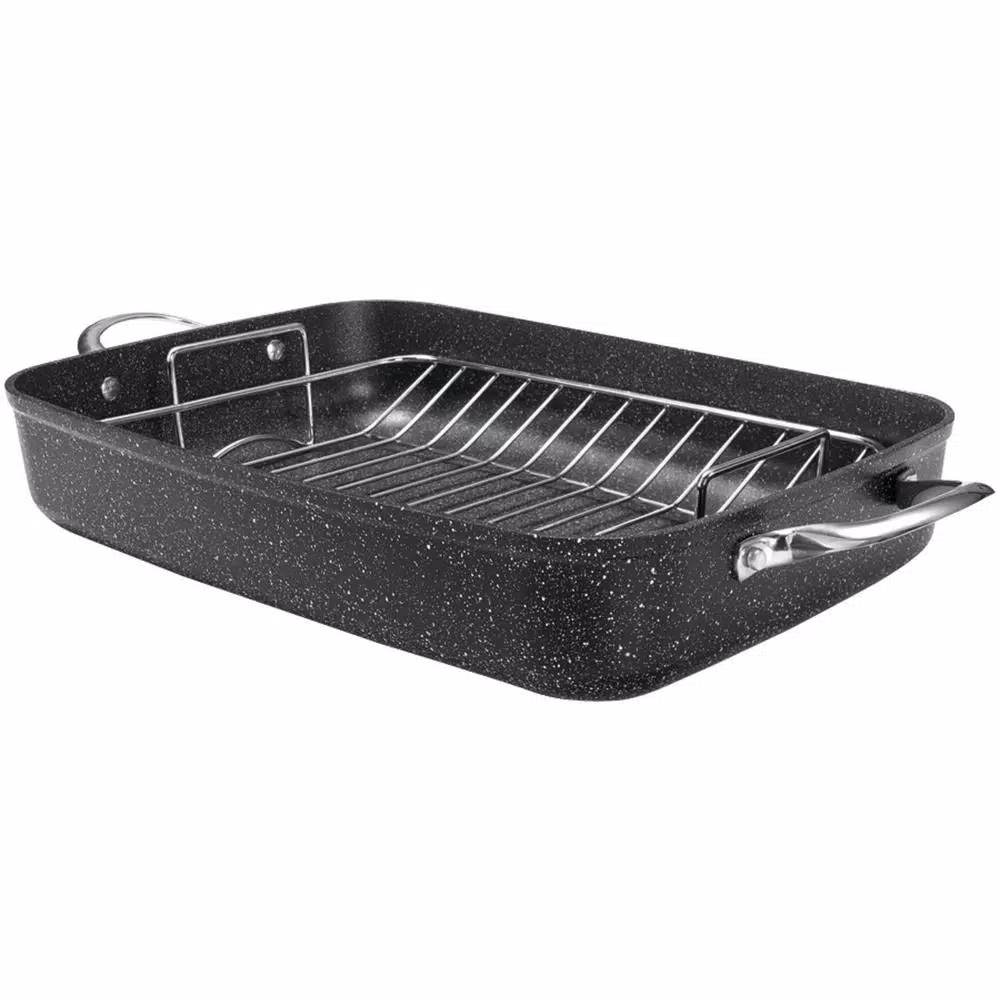 Enjoy roasting with ease using the Starfrit Rock Roaster with Rack. This durable roaster features a rocklike finish and quality non-stick coating. This pan is ovenproof, even on broil, up to 450ยฐF and is also dishwasher safe, making it as versatile as it is effective. This roaster will quickly become a well-used kitchen implement in any home.