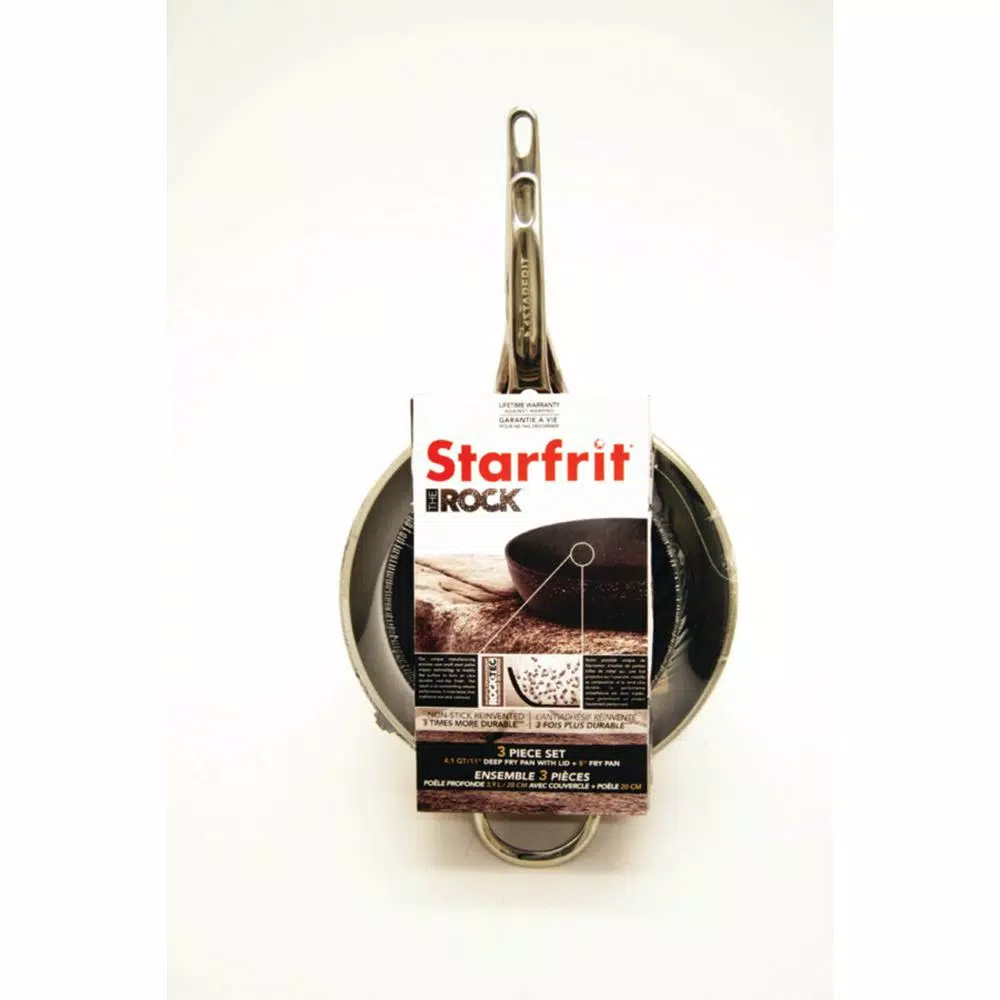 The Rock by Starfrit 3-Piece Cookware Set includes an 8 in. fry pan, an 11 in. deep pan in 4 Qt. size and the latterβs matching lid. This set makes a great addition to any kitchen, providing the utmost durability, abrasion resistance and nonstick performance. The unique manufacturing process uses small metal pellet impact technology to modify the surface to form an ultra durable rock-like finish. The result is an outstanding release performance 3 times better than traditional nonstick cookware.