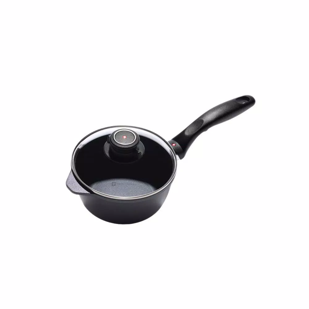 Thanks to high-quality European craftsmanship, the Swiss Diamond 1.4 Qt. (6.3 in.) Saucepan cleans up quickly and easily. The thick, heavy bottom prevents burning while the cast-aluminum construction warms contents evenly – less stirring required. The heat-tempered glass lid makes it easy to monitor your food while it cooks and even features an adjustable lid knob for advanced moisture control.
