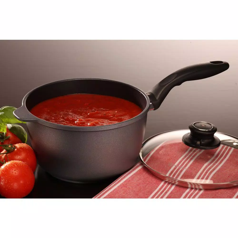 The Swiss Diamond 3.2 Qt. (8 in.) Saucepan is ideal for delicious gravy, spaghetti sauce, and more. Heavy-duty cast aluminum construction ensures even heat distribution without hot spots β less stirring required. Ergonomically designed handles stay cool on the stovetop. No more scrubbing and soaking β the diamond-reinforced coating ensures easy clean-up with warm water and a soapy sponge.