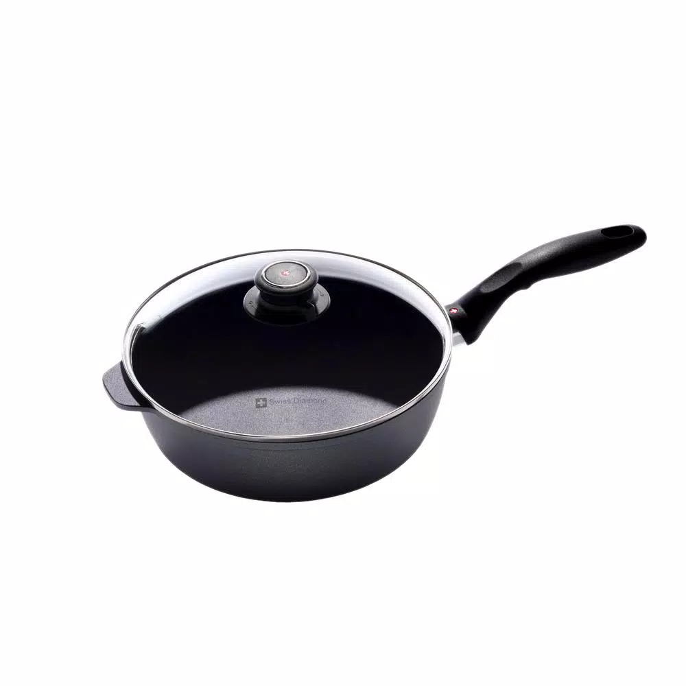 The Swiss Diamond 3.2 Qt. (9.5 in.) Saute Pan is ideal for cooking enthusiasts in search of a versatile addition to their cookware collection. High-quality and durable, this pan is guaranteed to transform your everyday cooking experience. The patented coating contains real diamond crystals and consistently delivers delicious results followed by easy clean-up. The cast aluminum body distributes heat evenly and efficiently.