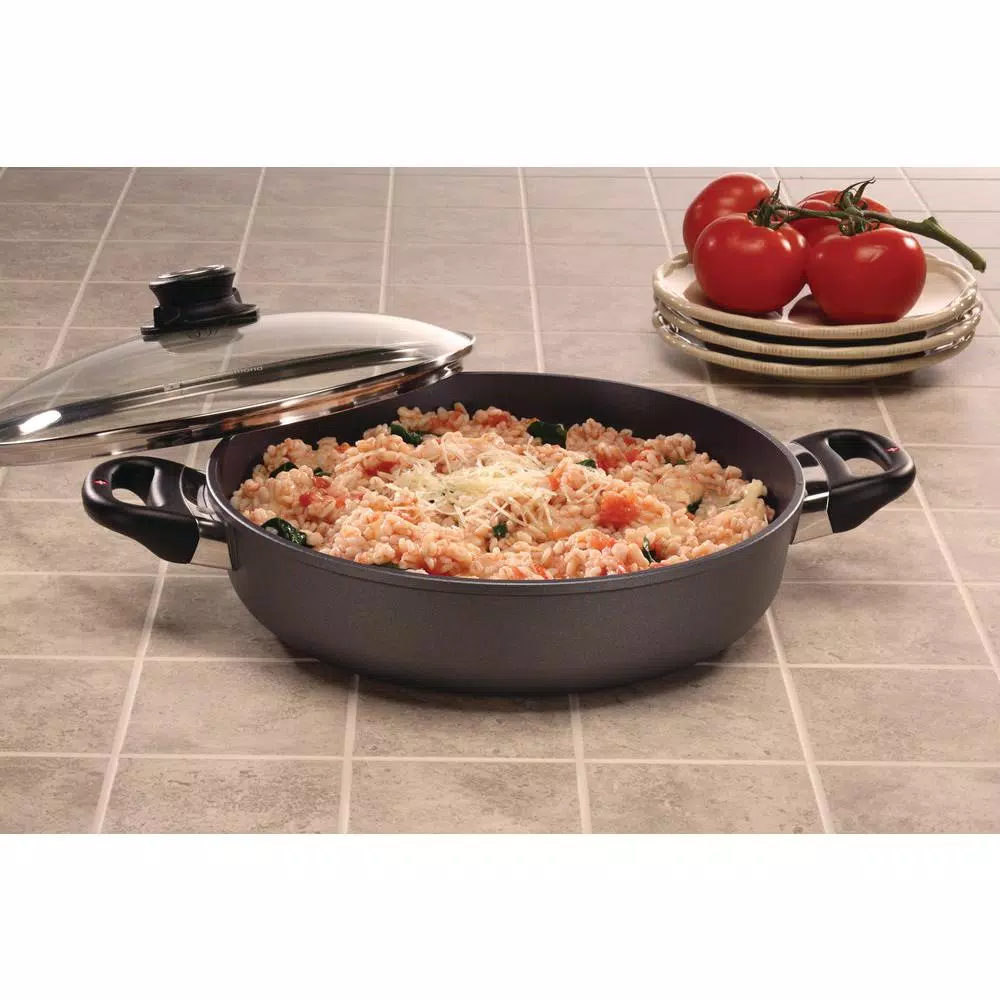 Begin your favorite recipe on the stovetop and finish it in the oven with the Swiss Diamond 11 in. Induction Sauteuse. With a cooking depth of approximately 2.4 in., this piece is the ideal size for easy stirring and fits comfortably on an oven rack allowing room for other bake ware. The patented coating is embedded with real diamond crystals to create a naturally nonstick surface that washes clean with just hot soapy water.