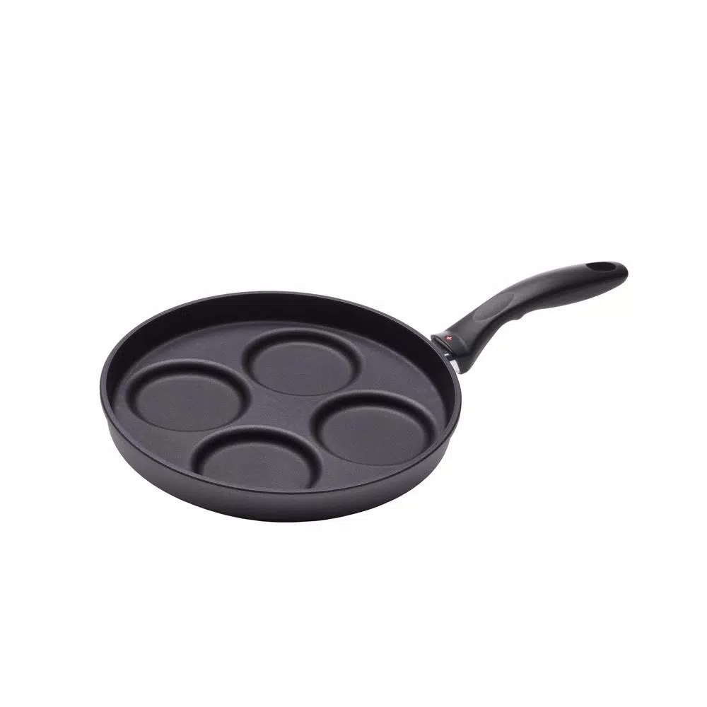Created for Swedish Pancakes, the Swiss Diamond Plett Pan is also ideal for perfectly round eggs, silver dollar pancakes, hamburger sliders, and more. It is the perfect replacement for leaky egg rings because its cast aluminum construction transfers heat up the sides of the pan, cooking the eggs all the way around rather than just on the bottom. The Plett Pan is also ideal for dorms, first apartments, and bachelor pads: heat up two halves of an English muffin, a slice of Canadian bacon, and cook an egg β all in one pan.