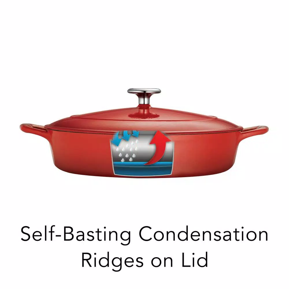 Pull out grandmaโs pot roast and potatoes recipe for this one. Nothing says โComfort Foods Cooked Hereโ like Tramontinaโs 4 Qt Enameled Cast-Iron Series 1000 Covered Braiser. Prized by cooks for heat retention and even cooking, this enameled cast-iron braiser comes in a vibrant, gradated porcelain-enamel exterior finish for elegant, and easy, kitchen-to-table serving. The self-basting condensation ridges on the lid uniformly collect and direct vapors onto food for flavor-filled savory dishes that are fall-off-the-bone moist. But donโt stop there! This one is also the perfect vessel for baking dishes and even for frying. The heavy-gauge cast-iron interior is coated with an off-white, smooth, and easy-to-clean porcelain-enamel finish, and sturdy side handles making handling a filled pan more manageable. Hand-wash only.
