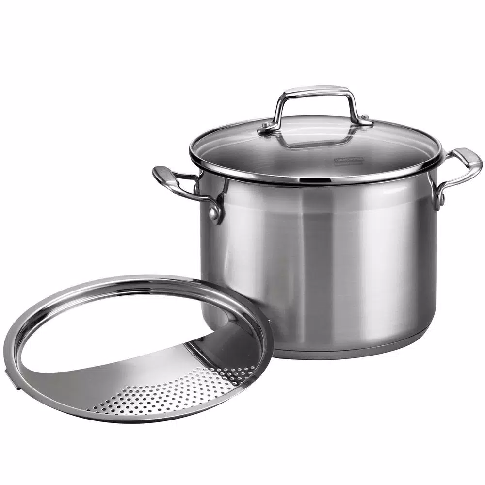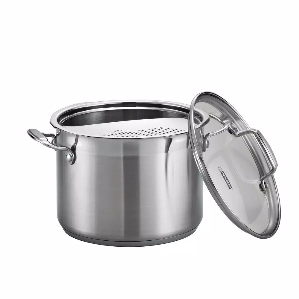 Take the clumsy awkwardness out of draining hot pasta. Tramontinaβs Gourmet 18/10 stainless steel 3 Pc 6 Qt Pasta Cooker makes draining large quantities of pasta, steamed veggies, even seafood and stocks, a breeze. The set includes: one 6 Qt pasta cooker; one tempered glass lid, and one locking strainer, each constructed in a magnetic three-ply base compatible with all cooktops, including induction and ceramic glass. Double-riveted, stainless steel handles stay cool and offer a comfortable grip. The set is dishwasher-safe, and oven-safe up to 500Β°F (260Β°C) without the glass lid and up to 350Β°F (176Β°C) with the lid. An excellent investment for professional chefs and cooking enthusiasts!