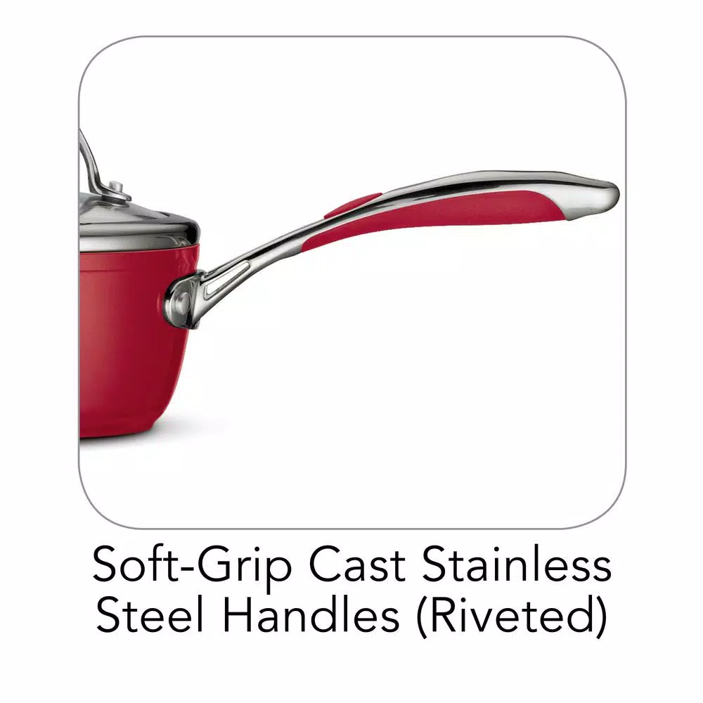 Outfit your first kitchen with reliable cookware thatβs at home on the cooktop and on the table top. The 1.5 Qt Ceramic Covered Sauce Pan in Tramontinaβs Gourmet Ceramica Deluxe line lets you whip up your signature stew or heartiest sauce perfectly every time, thanks to a heavy-gauge aluminum construction that allows for even heat distribution. The riveted, ergonomic, soft-grip cast stainless steel handle provides added support, while its metallic red exterior is a stand out on any table. The panβs smooth ceramic interior is PFOA-, lead- and cadmium-free, and easy to cleanβitβs dishwasher-safe! Depend on this one for everyday use with any cooktop or in the oven. Made in Italy and offered under a Lifetime Warranty.