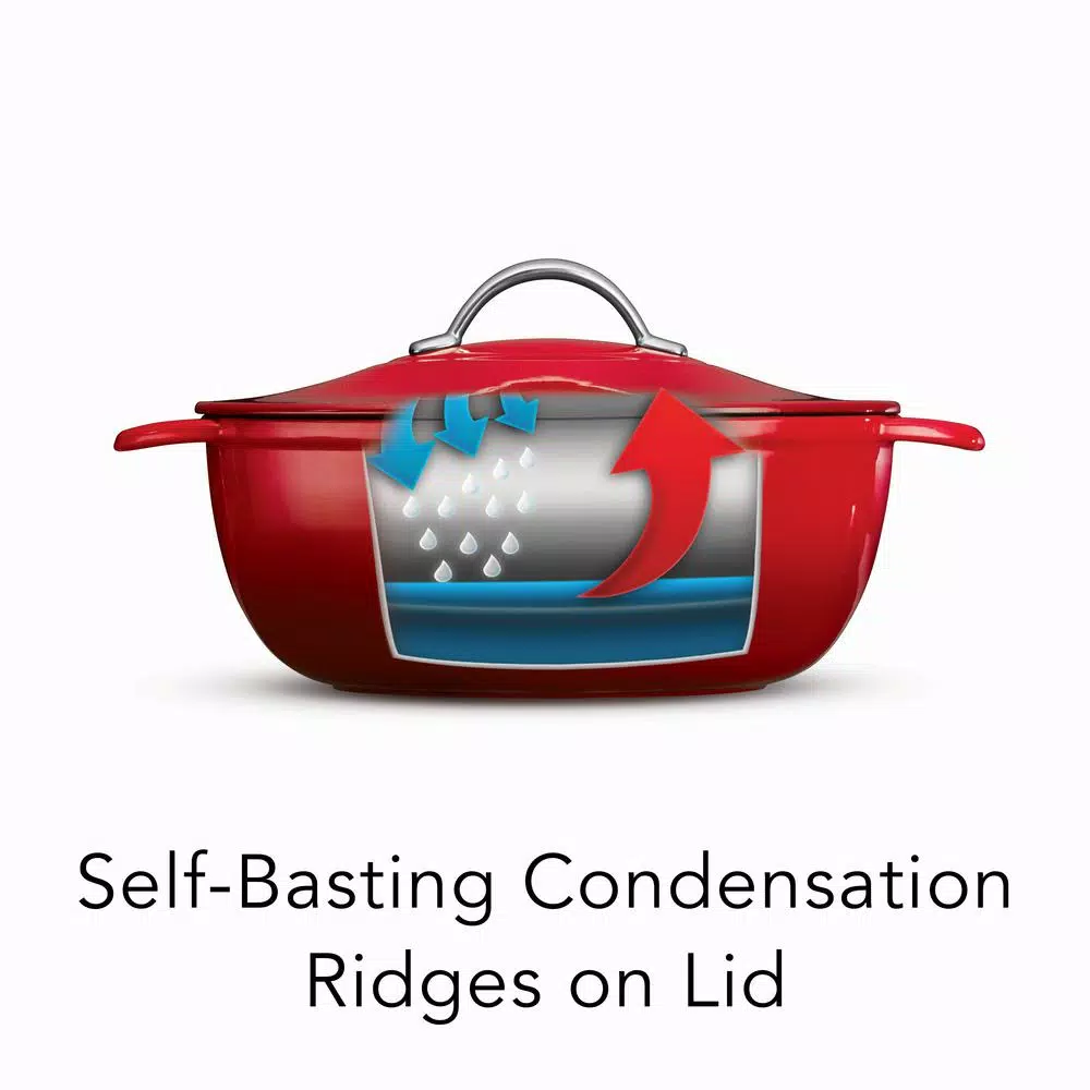 - Self-basting condensation ridges on lid uniformly collect and direct vapors onto food, producing moist and savory dishes