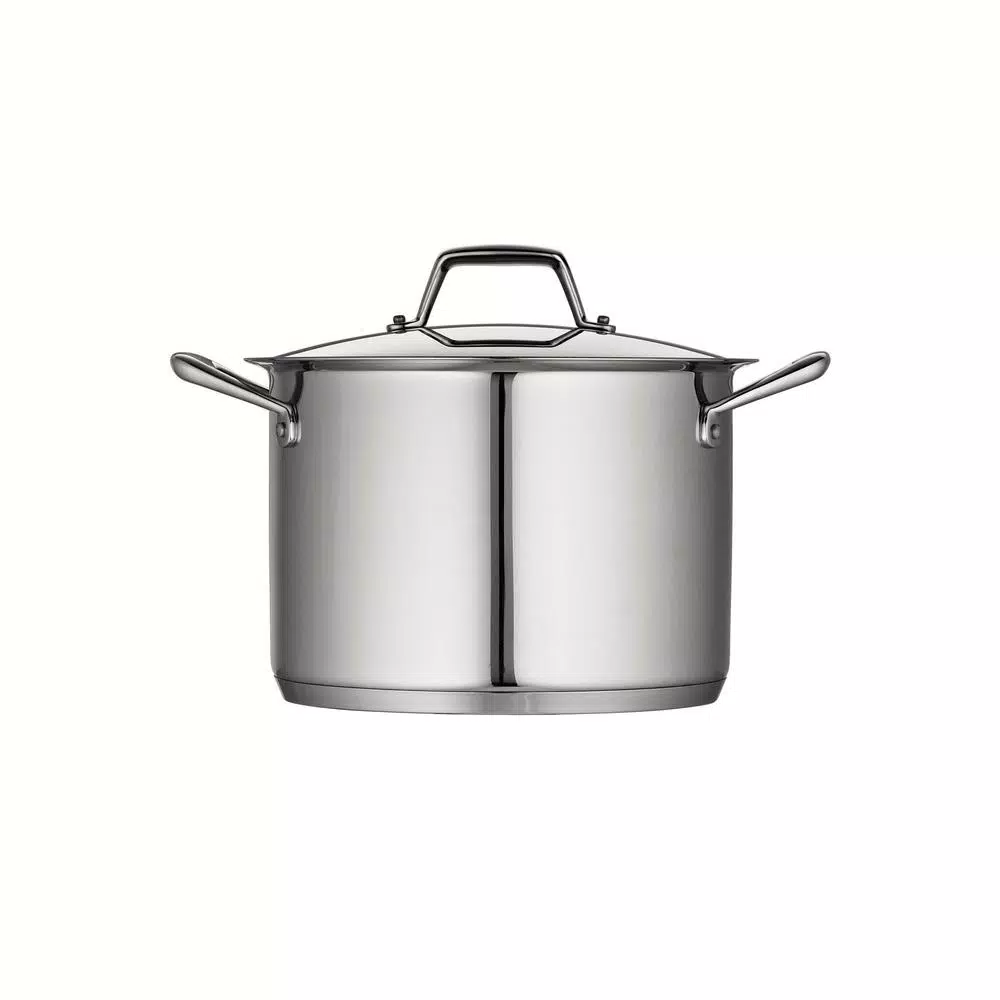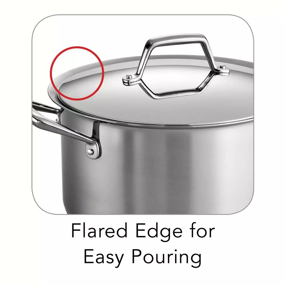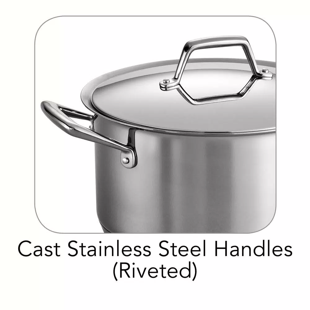 The Tramontina Gourmet 18/10 Stainless Steel Prima 8 Qt Covered Stock Pot delivers a sleek appearance, superior durability, and high performance to your kitchen. Excellent for making hearty sauces, soups, or stews, it can be used on your cooktop or in the oven. The Prima Stock Pot offers an elegantly styled vessel with a tri-ply base and mirror-polished exterior finish. Its tri-ply base is impact-bonded with a pure aluminum core sandwiched between a layer of 18/10 stainless steel and a layer of magnetic stainless steel, providing even heat distribution and compatibility for all cooktopsโincluding induction. As an added detail, its modern lines feature a flared edge for easy and dripless pouring, a precision-fitted 18/10 stainless steel lid to lock in heat and nutrients, and cast stainless steel handles that are riveted for added strength and support when handling the cookware. Ideal for professional kitchens and those serving large parties!