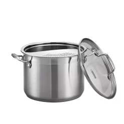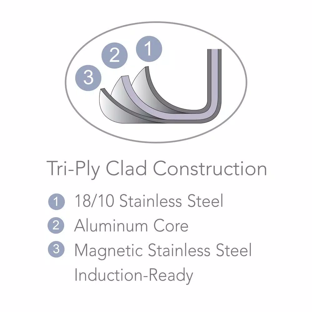 - Tri-ply clad construction (18/10 stainless steel, aluminum core, magnetic stainless steel)