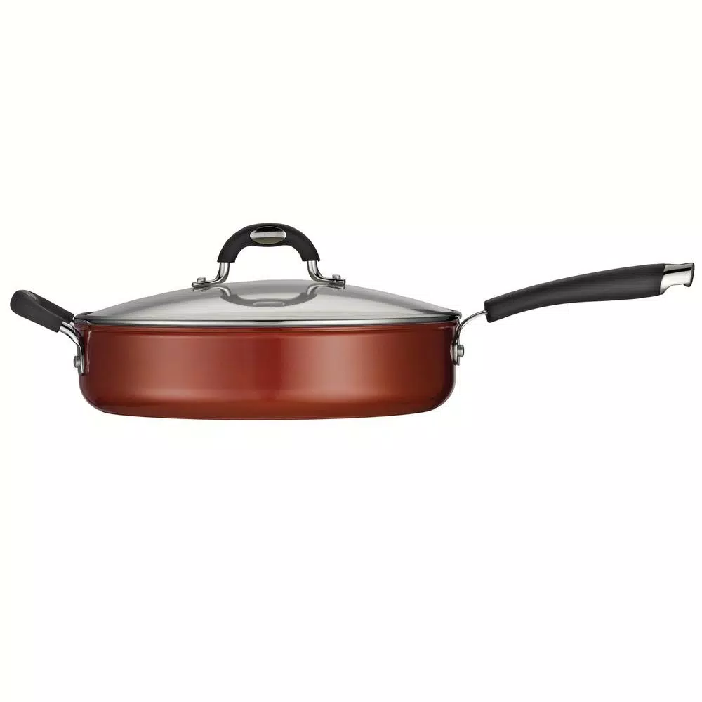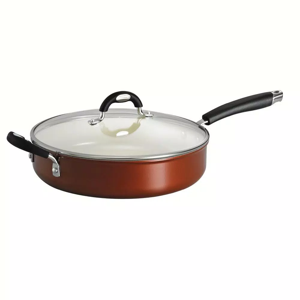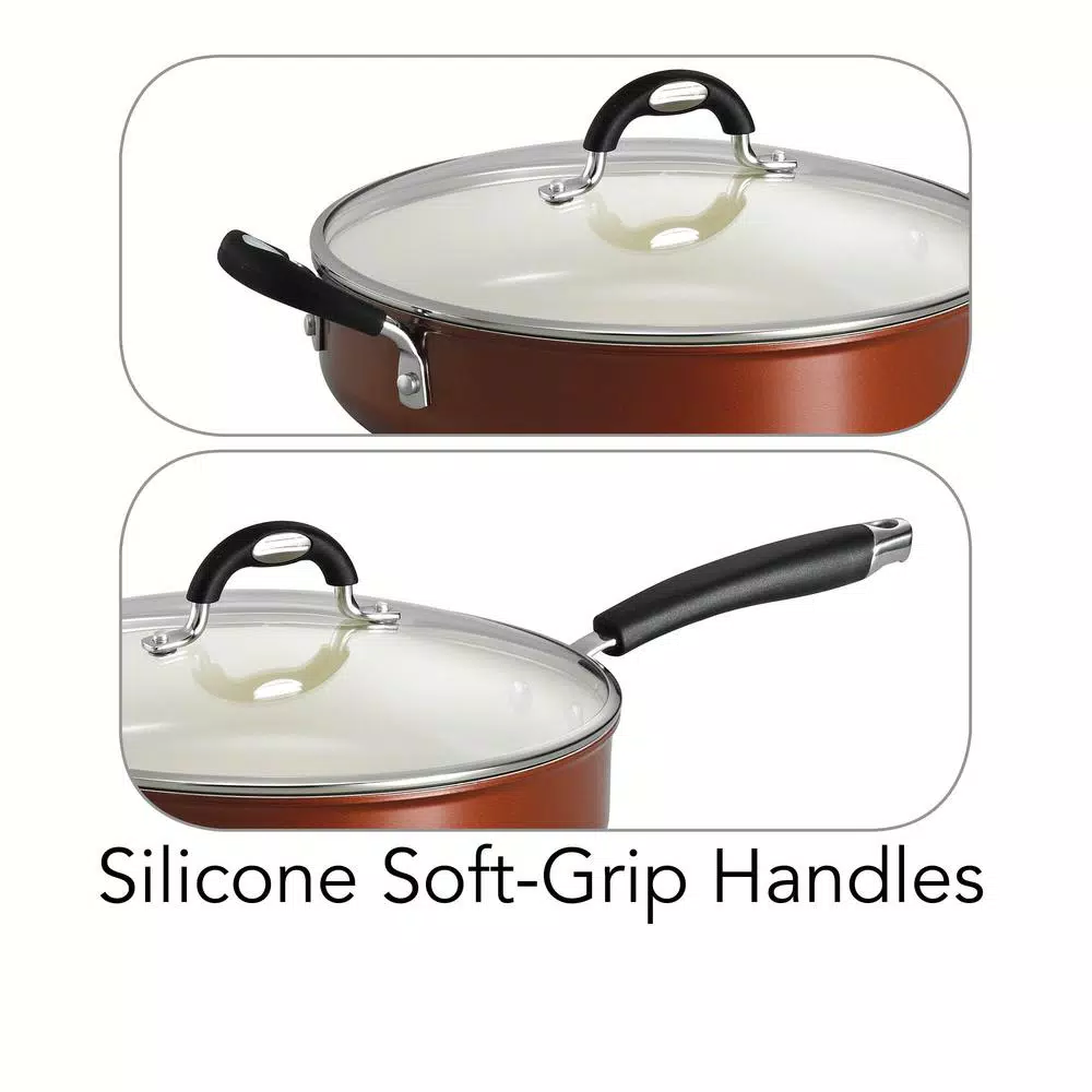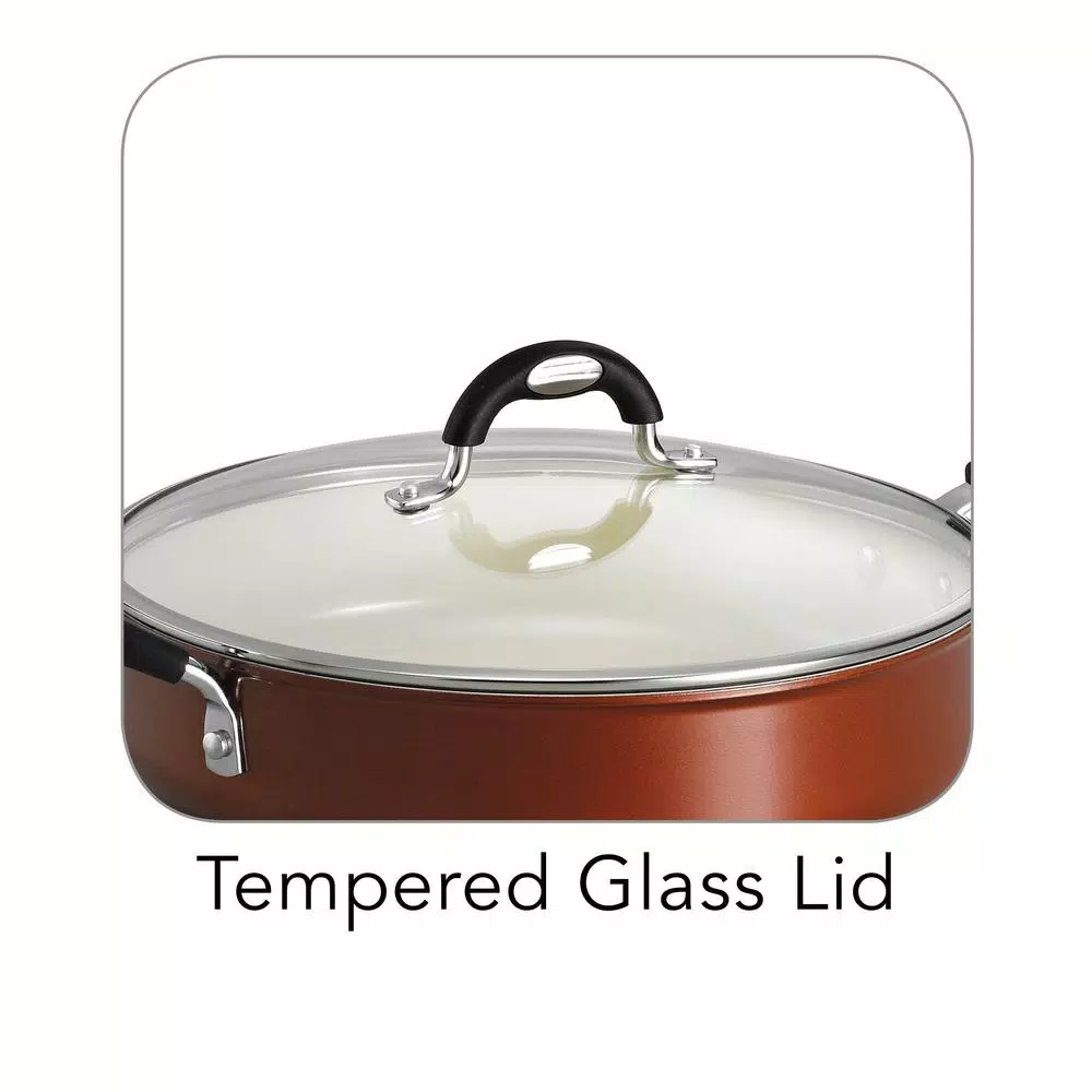 Tacos, stir fry, cornbread, fried fish—Tramontina’s Gourmet Deluxe Metallic Copper 12 in Ceramic Covered Deep Skillet can take on a variety of dishes with ease, in professional and home kitchens alike. The skillet features a durable, metallic copper Porcelain-enamel exterior and a smooth, PFOA-, PTFE-, lead- and cadmium-free ceramic interior which provides simple healthy cooking, effortless cleaning and outstanding durability, while the soft-grip, cast stainless steel handle ensures comfort and stability when handling cookware. Made in Italy.